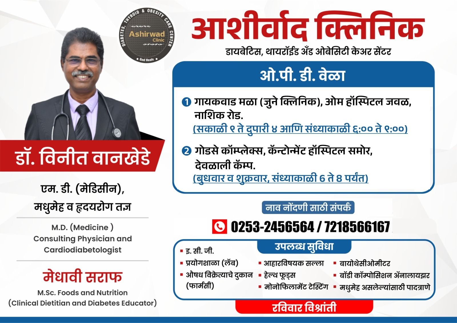 At Ashirwad Clinic we have Centrally located Ample Parking, Lift with backup, Lab, Dietician, Pharmacy, Counselling and consultation all under one roof.